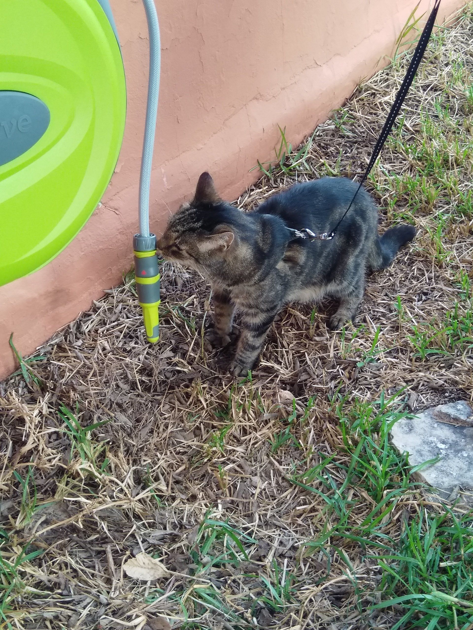 In het begin liep Moppie aan een lijntje buiten, maar inmiddels loopt hij vrij rond en heeft hij het dak al geïnspecteerd.