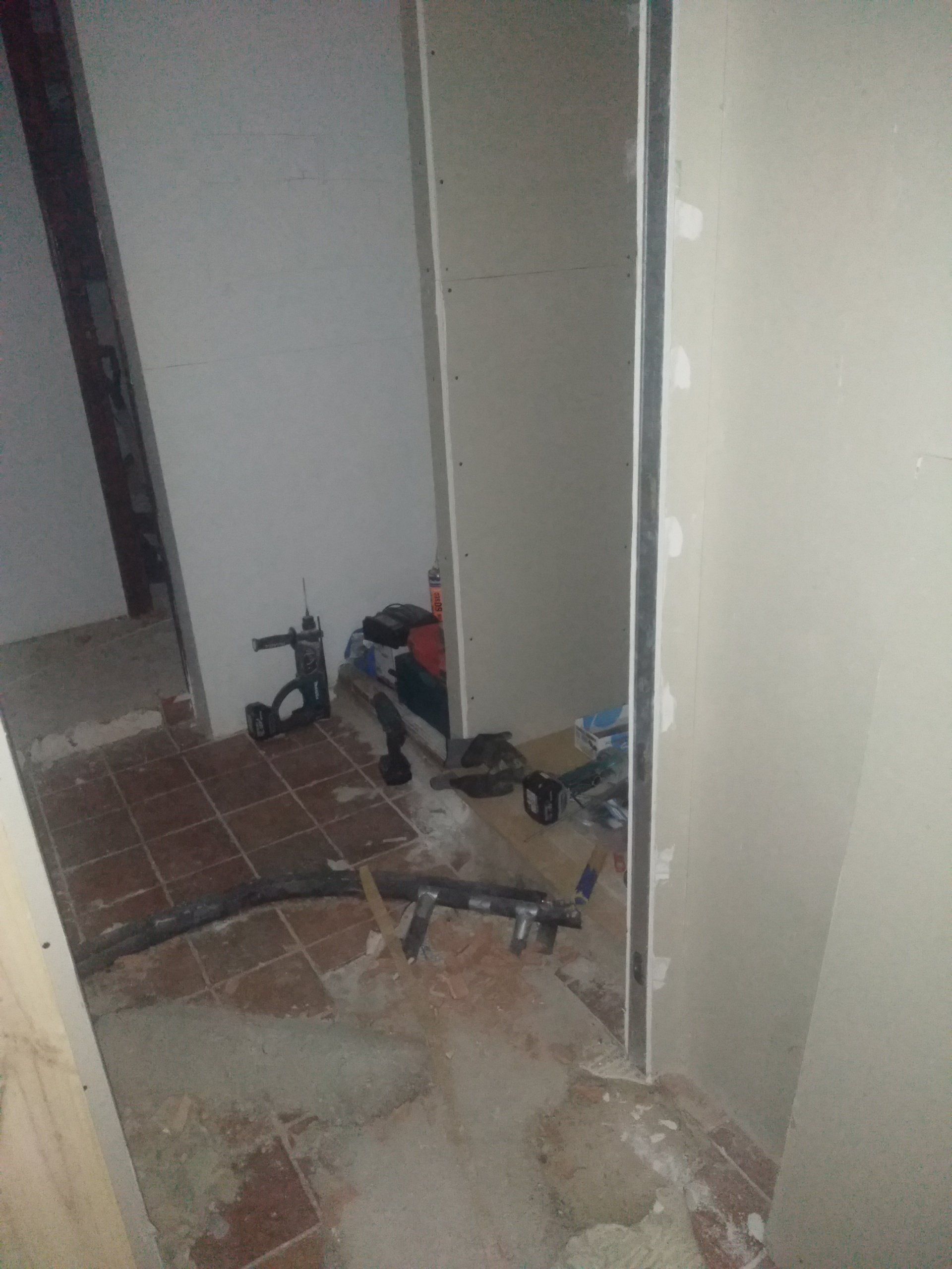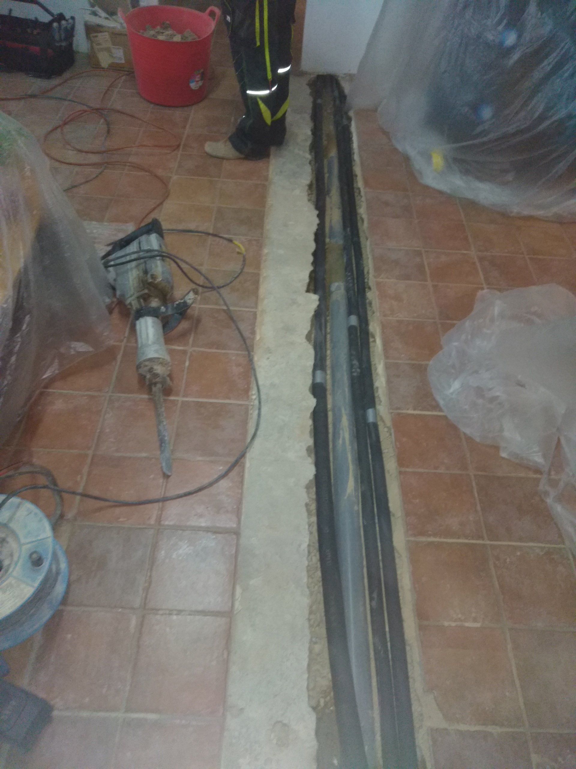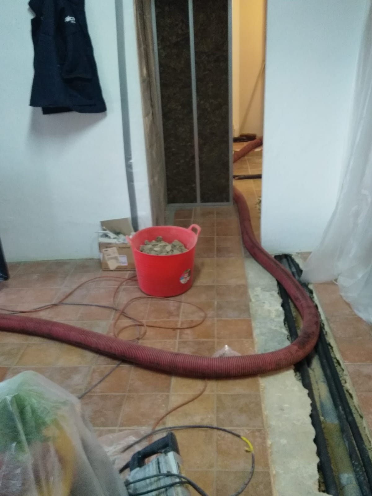 Er is al heel wat gesloopt. Wat een bende geeft dat. We kunnen nog in de keuken zitten, de slaapkamer gebruiken en onze badkamer. De rest is ontoegankelijk en een grote zooi. Vloeren zijn eruit, gleuven gefreesd, plafonds zijn eruit. We hebben binnen alles afgedekt met plastic om het een beetje gruisvrij te te houden, maar dat is niet helemaal gelukt.