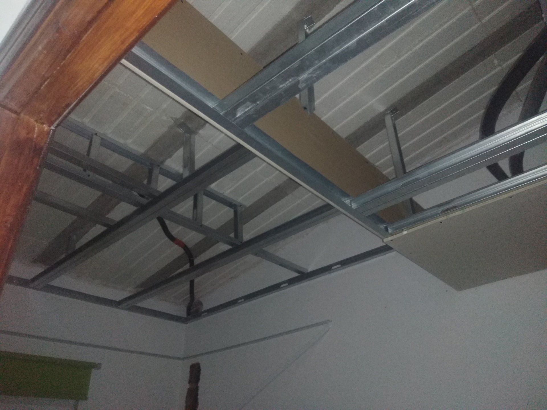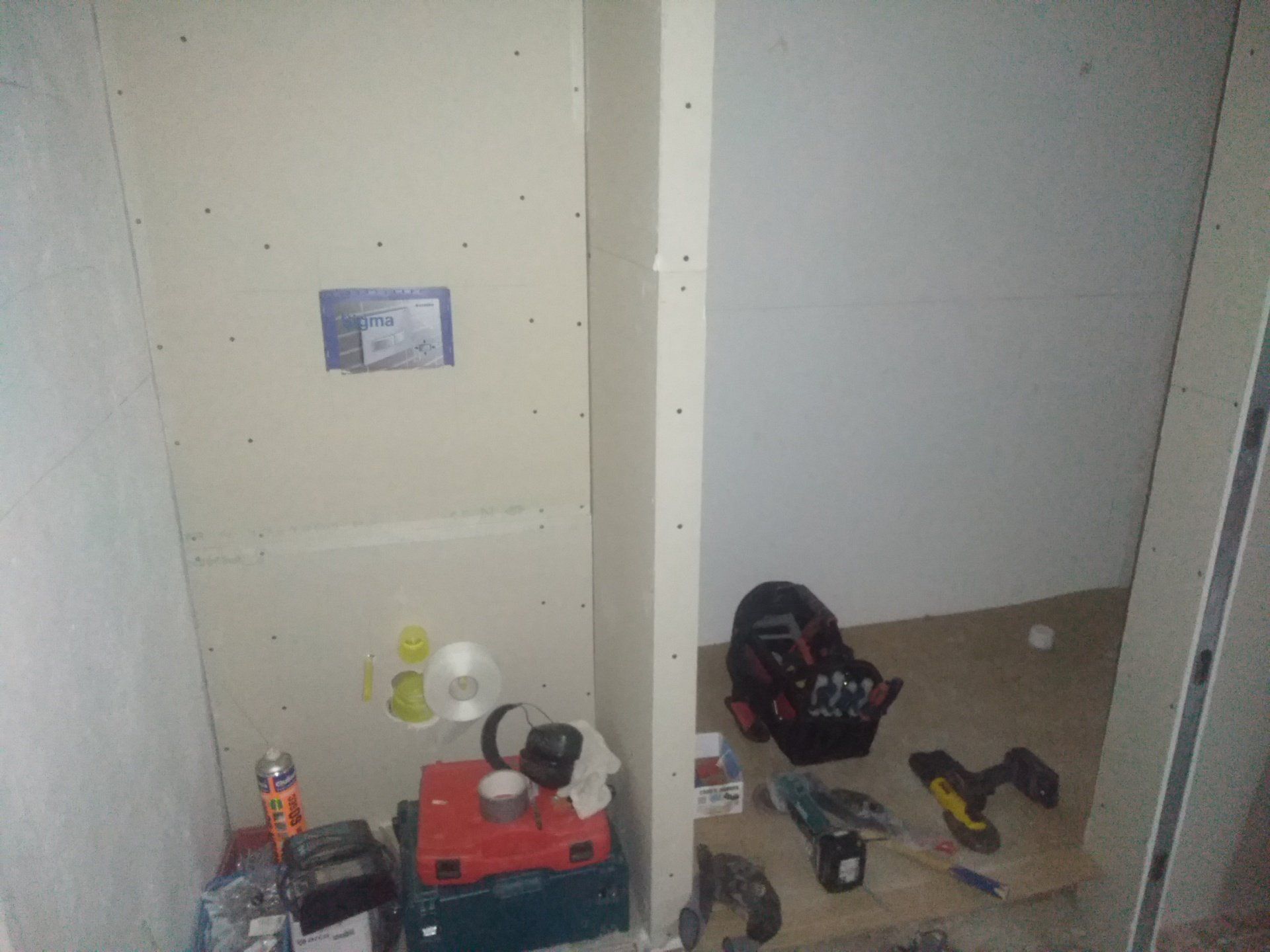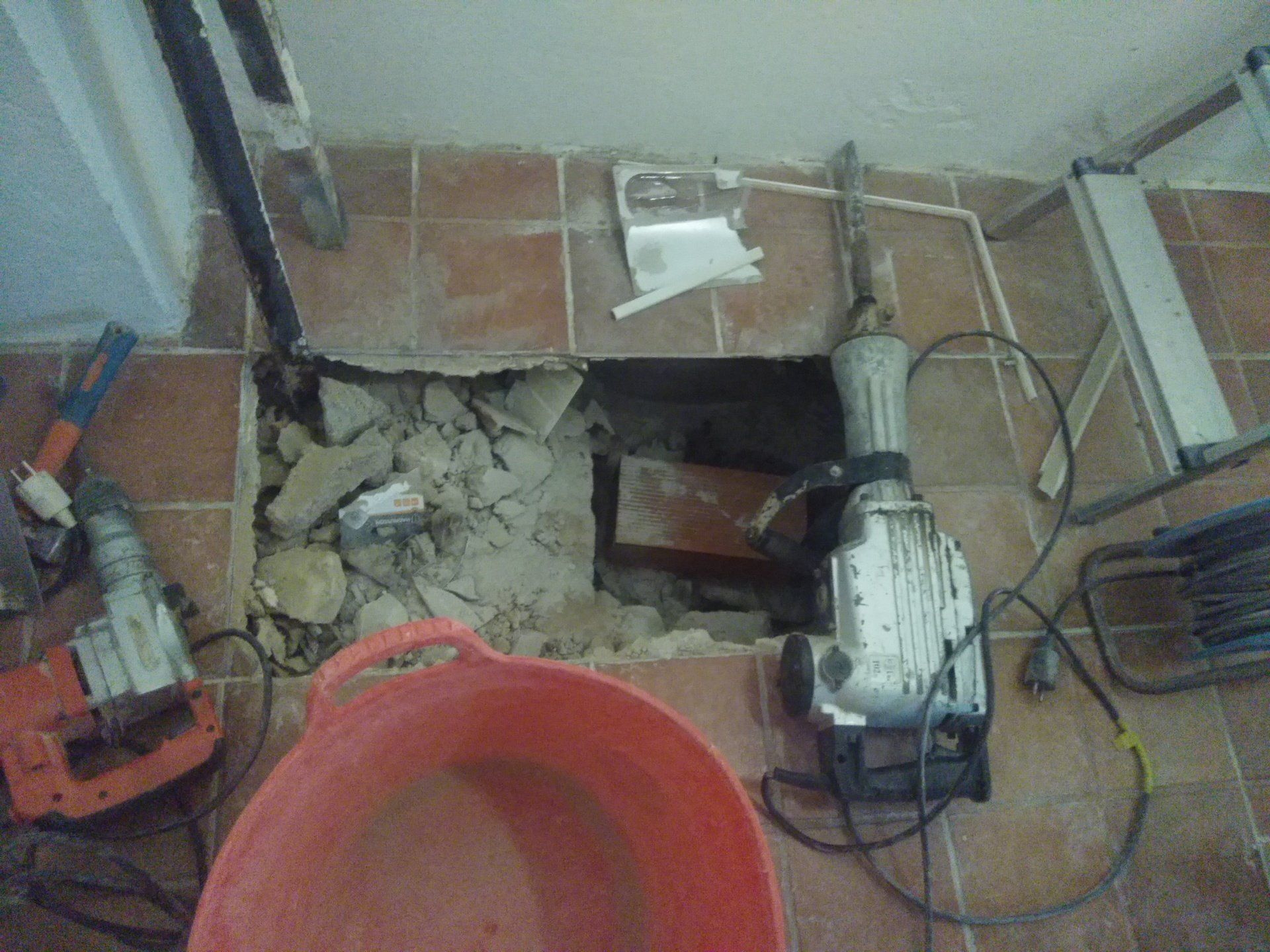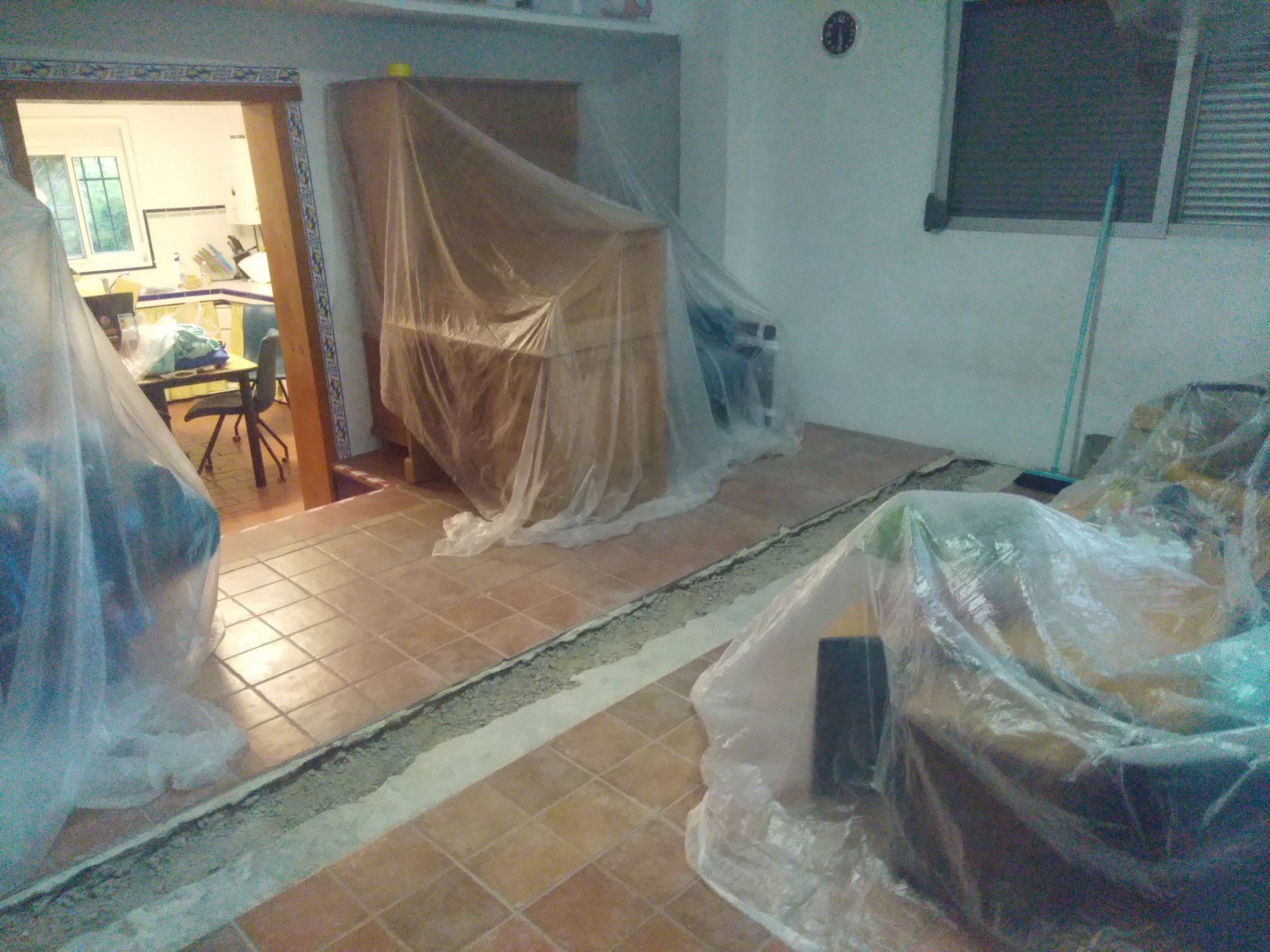 Er is al heel wat gesloopt. Wat een bende geeft dat. We kunnen nog in de keuken zitten, de slaapkamer gebruiken en onze badkamer. De rest is ontoegankelijk en een grote zooi. Vloeren zijn eruit, gleuven gefreesd, plafonds zijn eruit. We hebben binnen alles afgedekt met plastic om het een beetje gruisvrij te te houden, maar dat is niet helemaal gelukt.