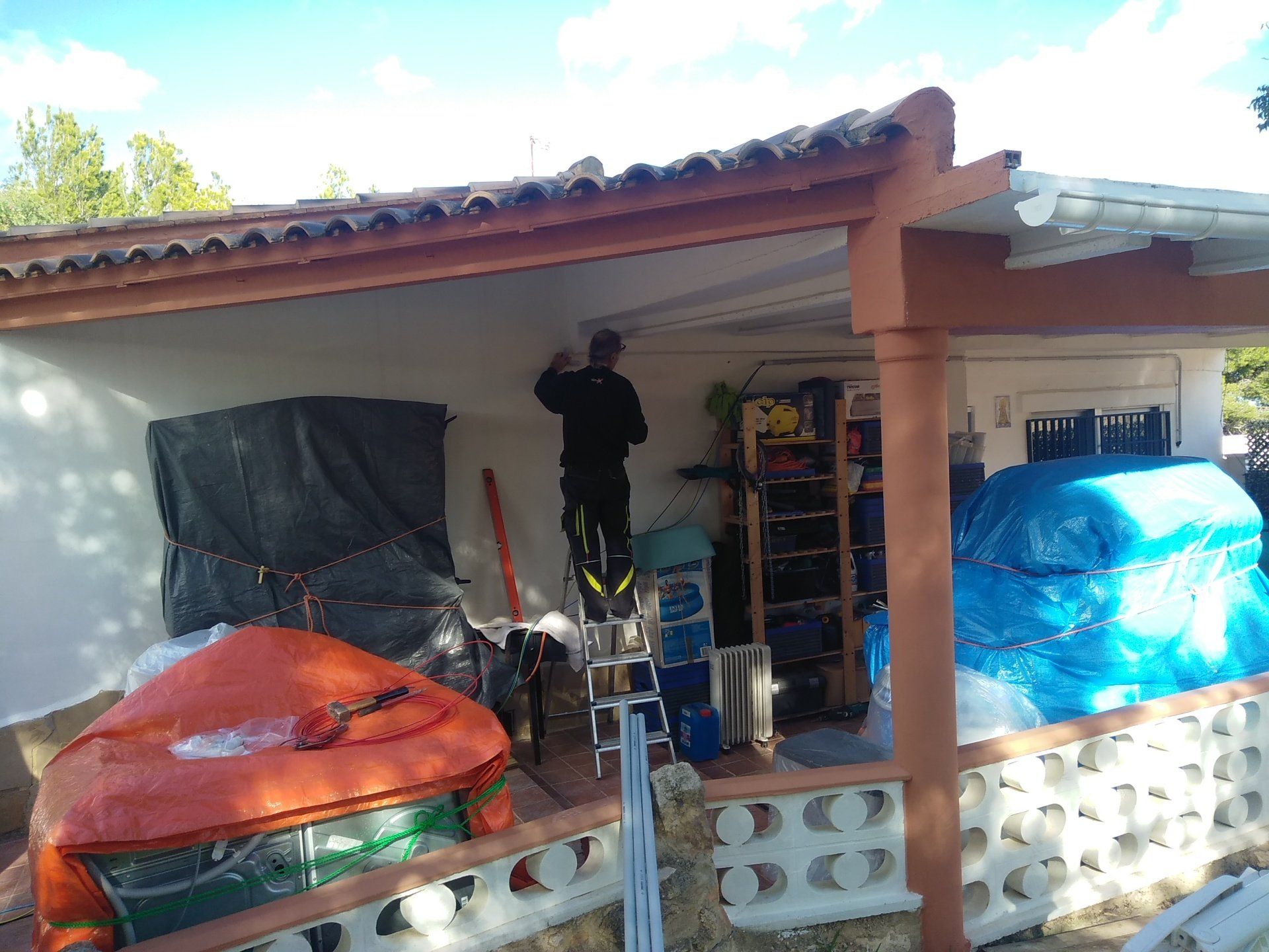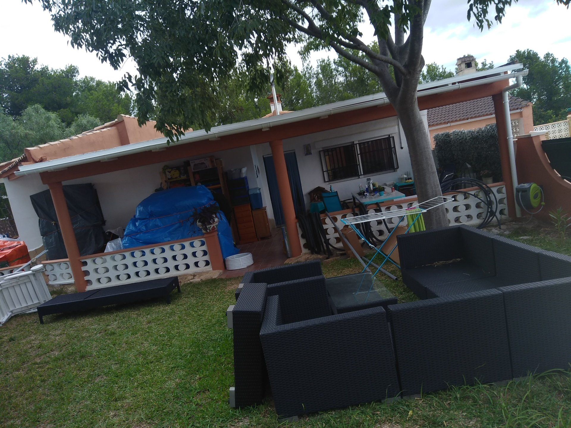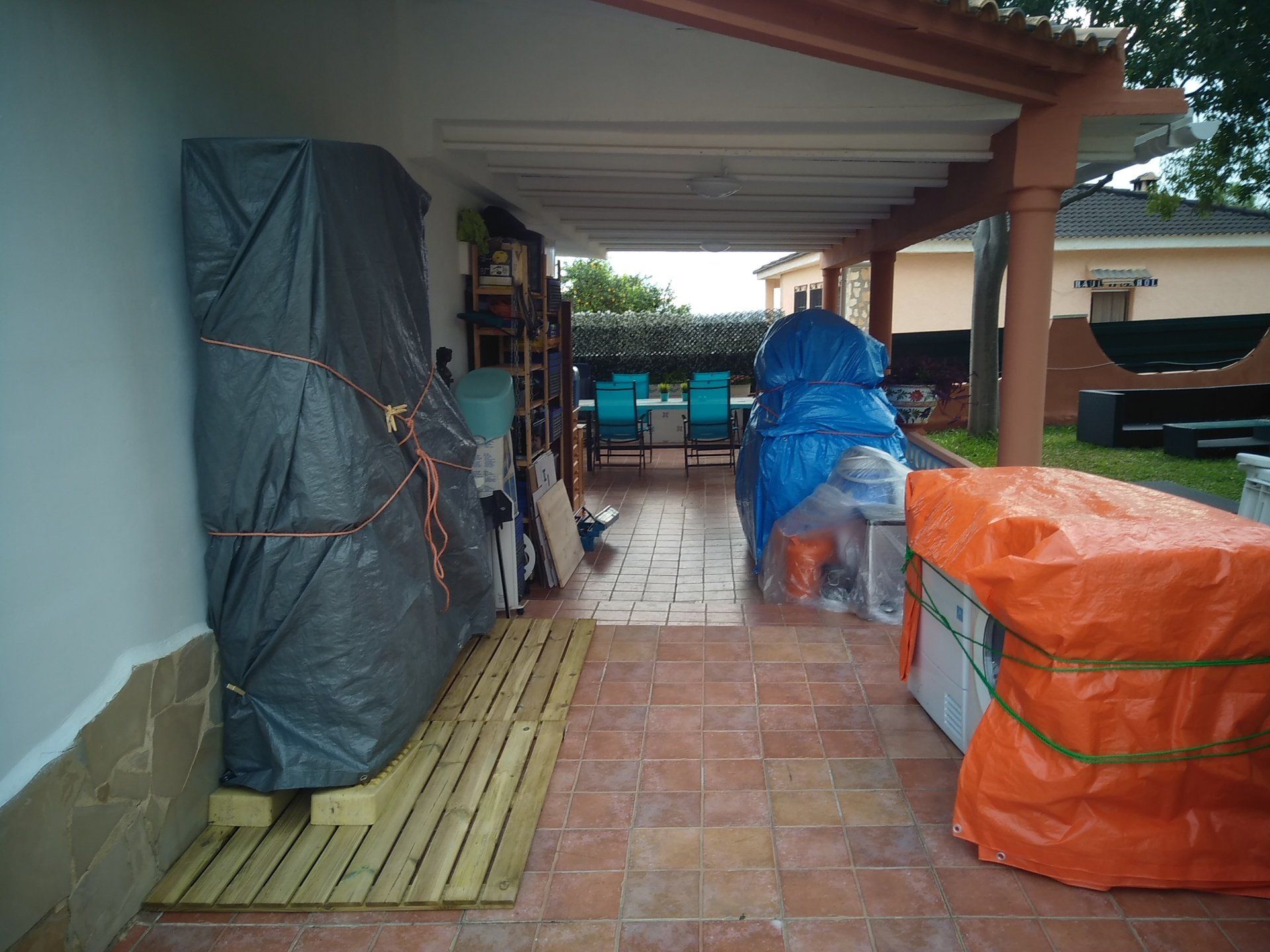 Onze huisraad staat deels bij buurman Jaime opgeslagen in de garage en deels staat het op de veranda op pallets en onder plastic.
