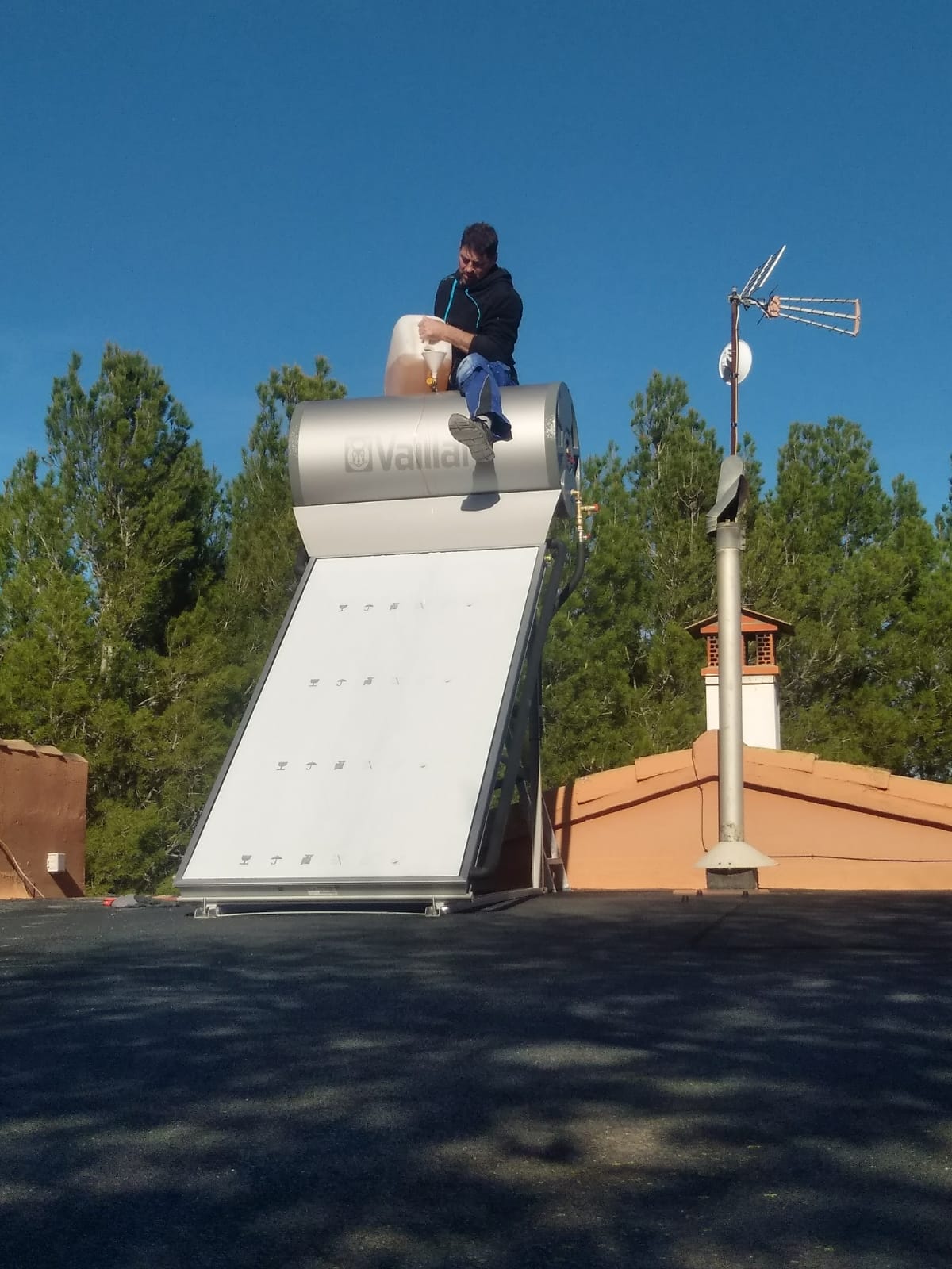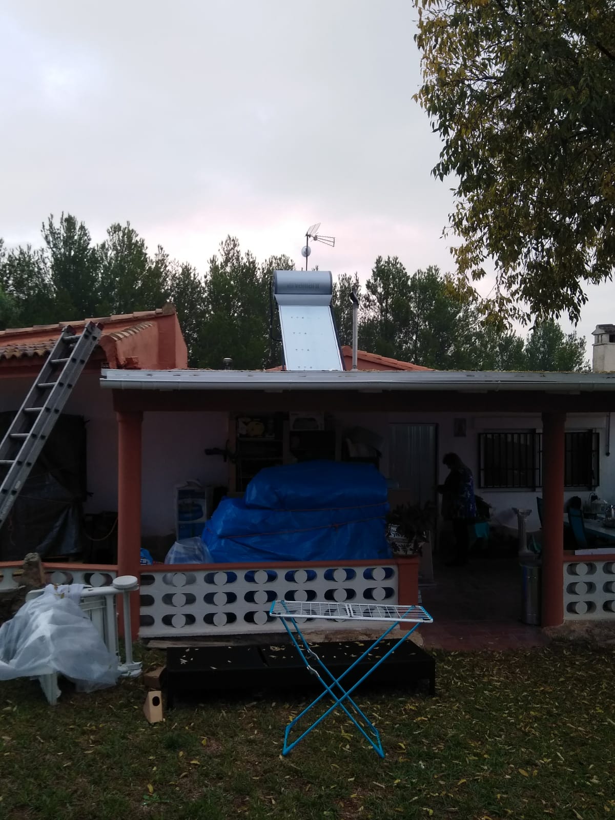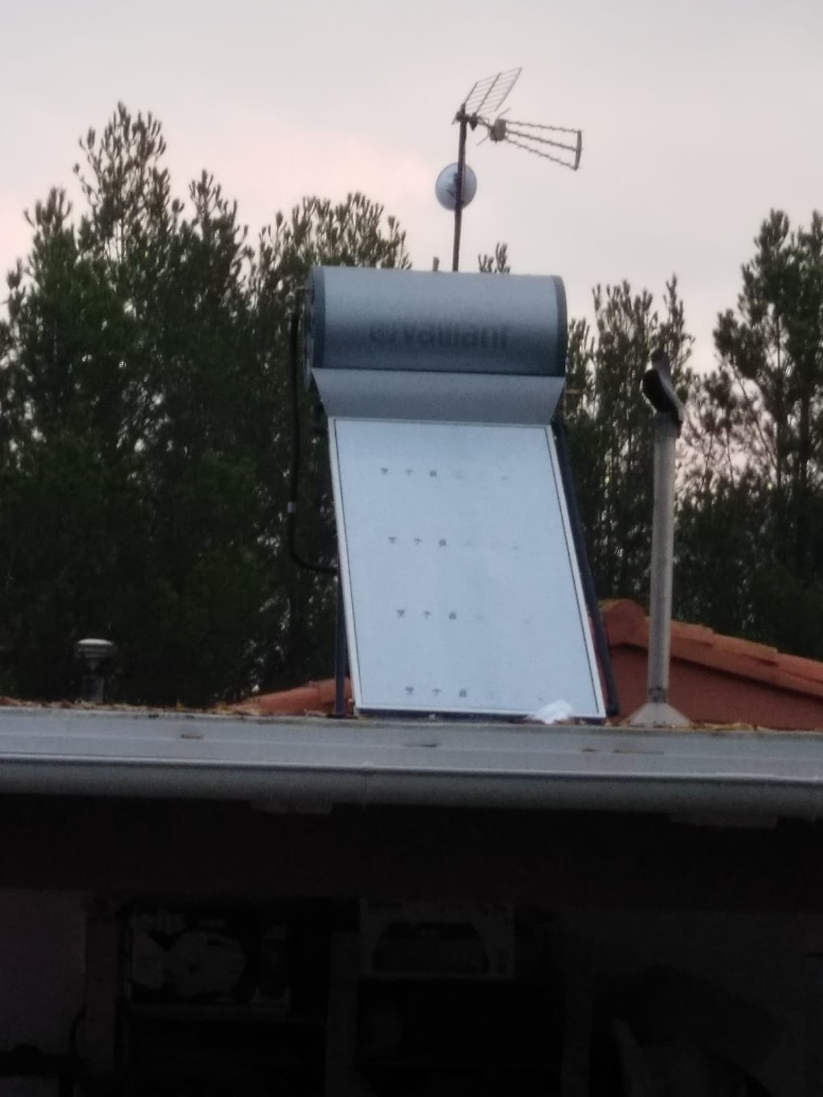 Er staat inmiddels een zonneboiler op het dak en die werkt prima. Na een grote hoosbui bleek dat het gerepareerde lekke dak nog niet helemaal waterdicht is. Dus dat was een goede test en het dak moet is daarna gerepareerd