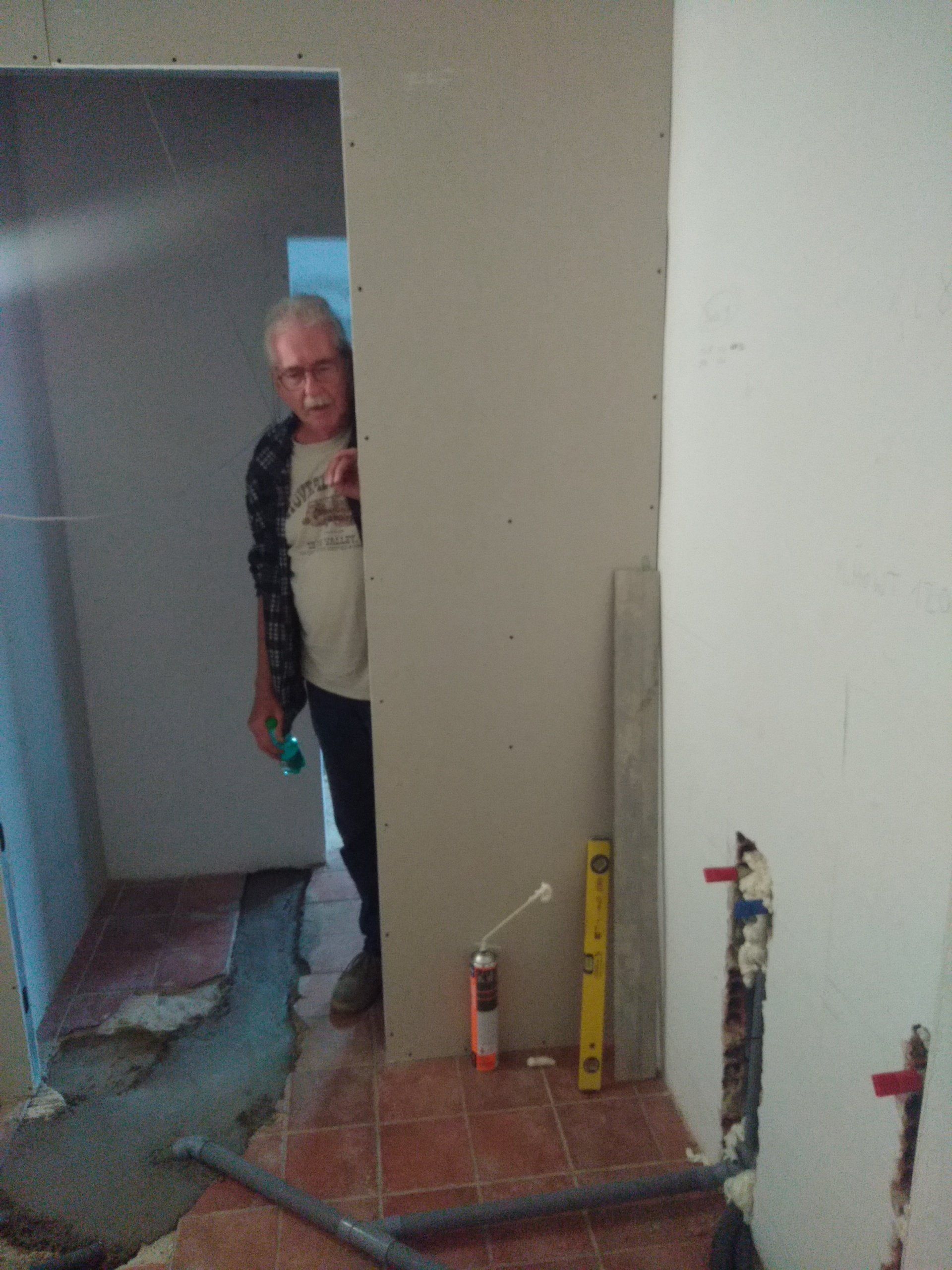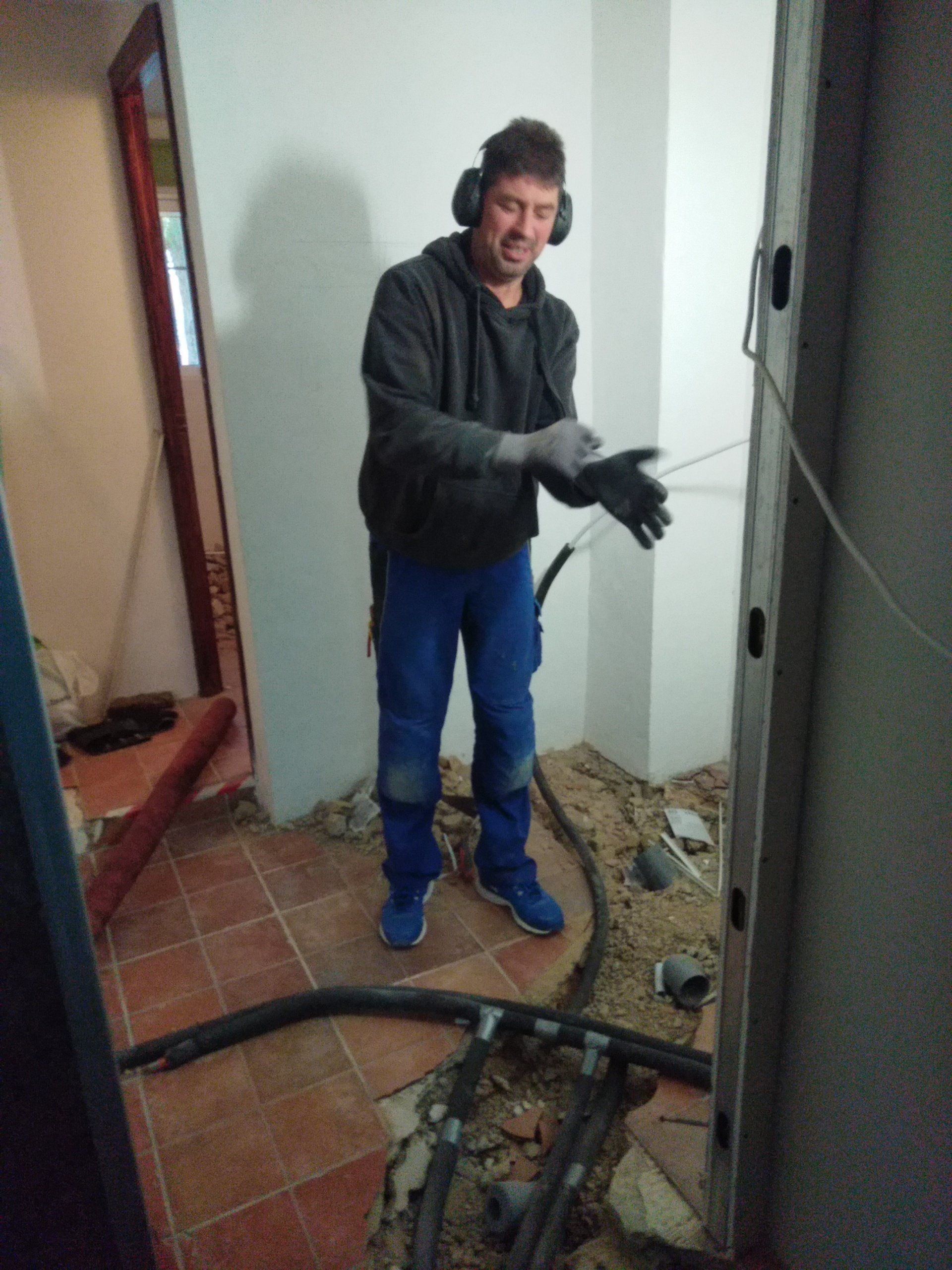 Er wordt gewerkt aan een nieuwe badkamer, de gastenkamers krijgen een nieuw plafond, nieuwe bedrading, nieuwe vloeren, deuren naar buiten. Daarna wordt de andere badkamer gesloopt en opnieuw gemaakt. We hopen dat daar de rest van de septic tank onder zit.