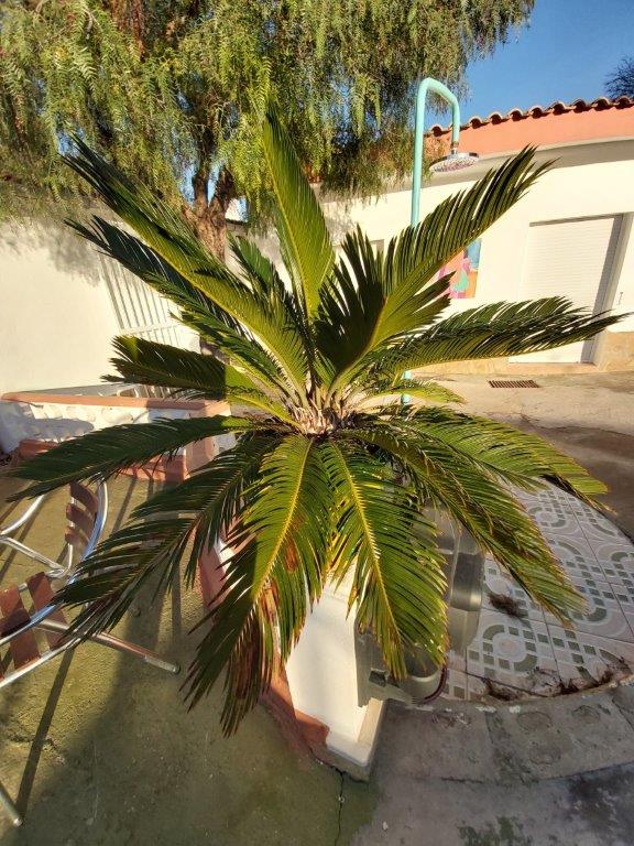 Onze pot met daarin een kleine palm, is door een rukwind spontaan de lucht in geblazen en in stukken gevallen.