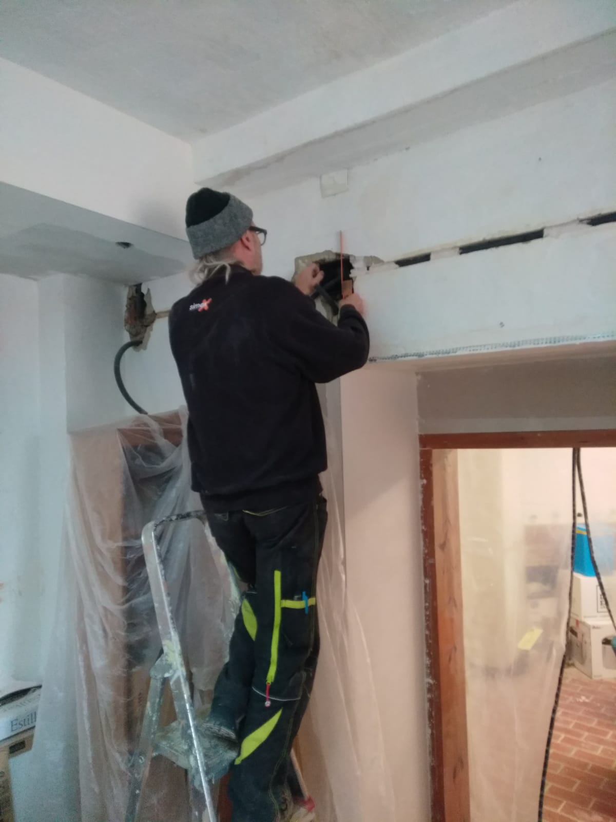 In de nieuwe keuken zijn al wat leidingen gefreesd voor water en elektriciteit. In de woonkamer moet de elektriciteit nog gemaakt worden. De oude keuken moet nog gesloopt worden. De wanden moeten nog worden gestuct.